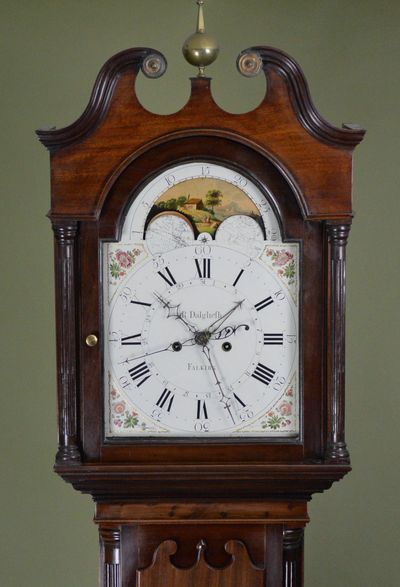 An Interesting George 3rd Longcase clock by Robert Dalgleish - Falkirk with painted dial and mahogany case, typically styled for that region at the time. The mechanisms most interesting feature is the pin wheel escapement which is rarely seen in Scottish longcase clocks, not to mention incorporation of a sweep center seconds hand. The clock also displays a calendar and phases of the moon.