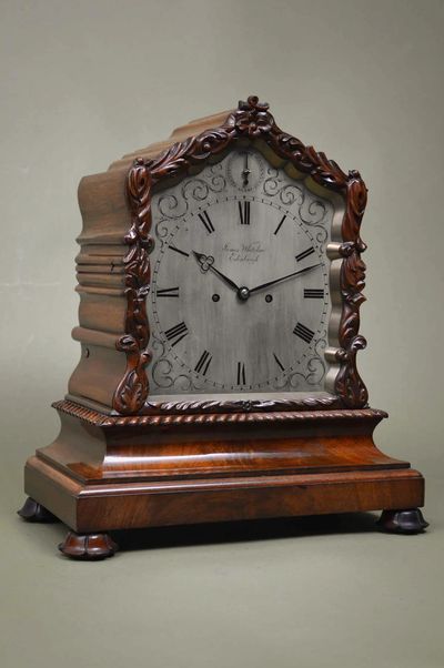 A finely made carved mahogany bracket clock, signed "James Whitelaw - Edinburgh," showcases the excellent craftsmanship of this long established Edinburgh clock company. This exquisite piece features an 8-day Fusee anchor escapement mechanism that strikes the hours on a large coiled gong. The silvered brass dial is beautifully engraved with Roman numerals and fine scroll work, reflecting the quality associated with Edinburgh clocks. The robust mechanism also incorporates a strike/silent function, making it a perfect addition to any home.