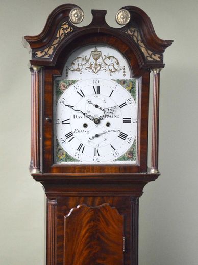 Mahogany long case clock with a painted Robert Burns "Tam o Shanter" themed dial.