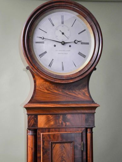 Mahogany long case clock with a painted Robert Burns "Tam o Shanter" themed dial.